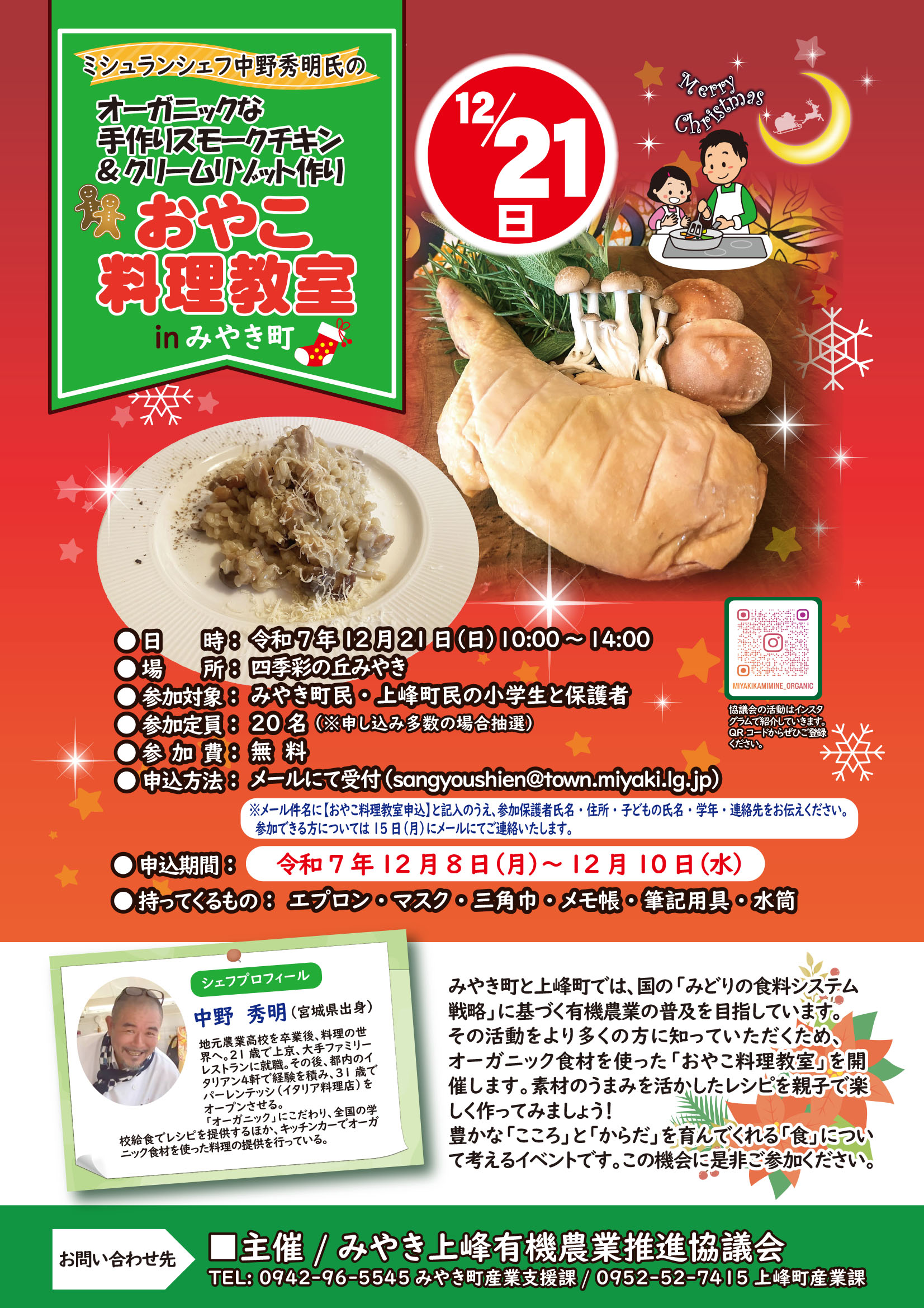 シェフのオーガニックな手作りスモークチキン&クリームリゾット作りおやこ料理教室(主催:みやき上峰有機農業推進協議会)
