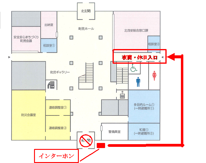 ●閉庁時:南側のインターホンを押していただくと、警備員が応答しますので、東側入口から出入りしてください。