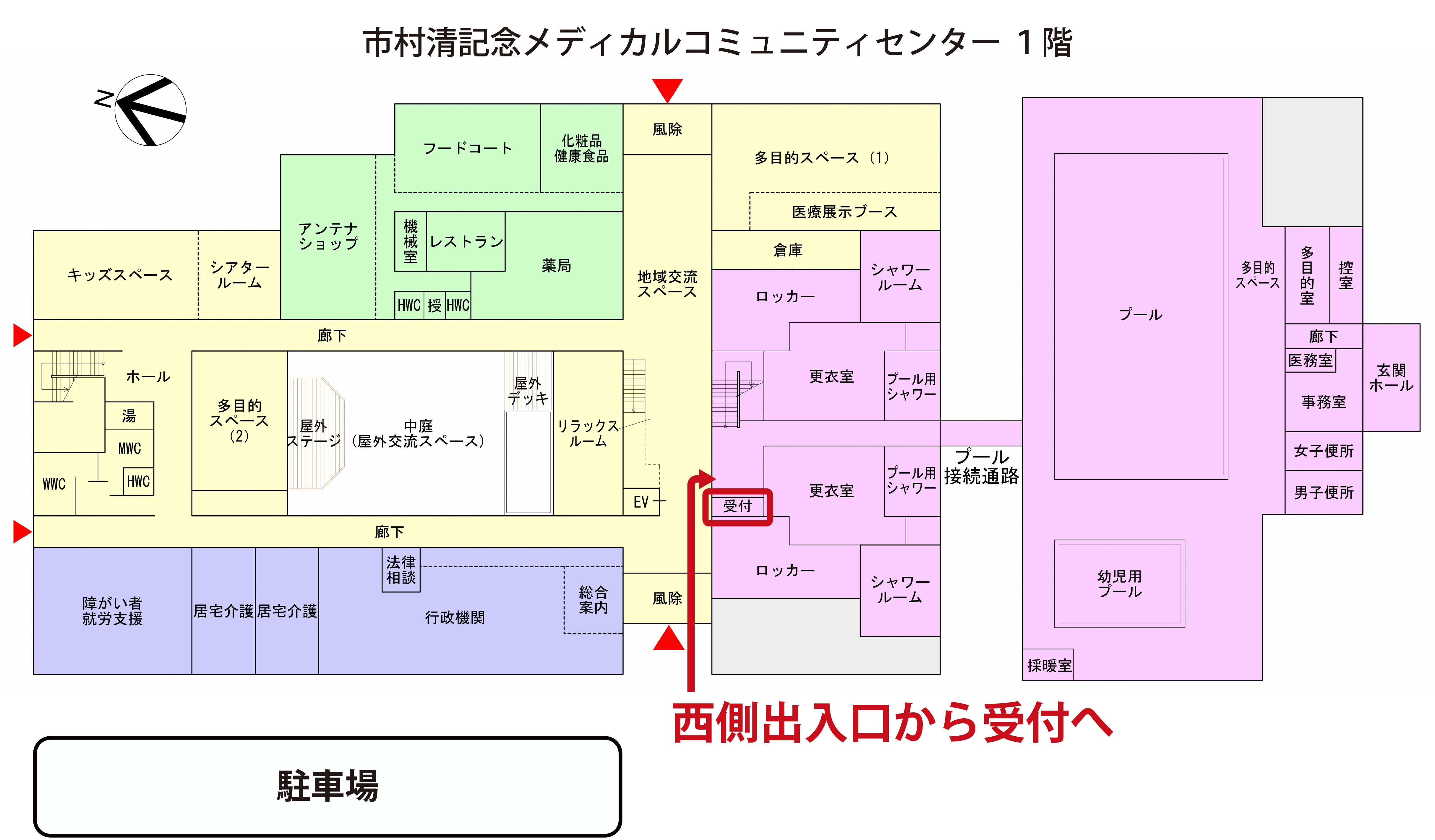 - プールをご使用される方の出入りに関して、下記図のとおりメディカルコミュニティセンター西側出入口から行っていただきますようお願いいたします。