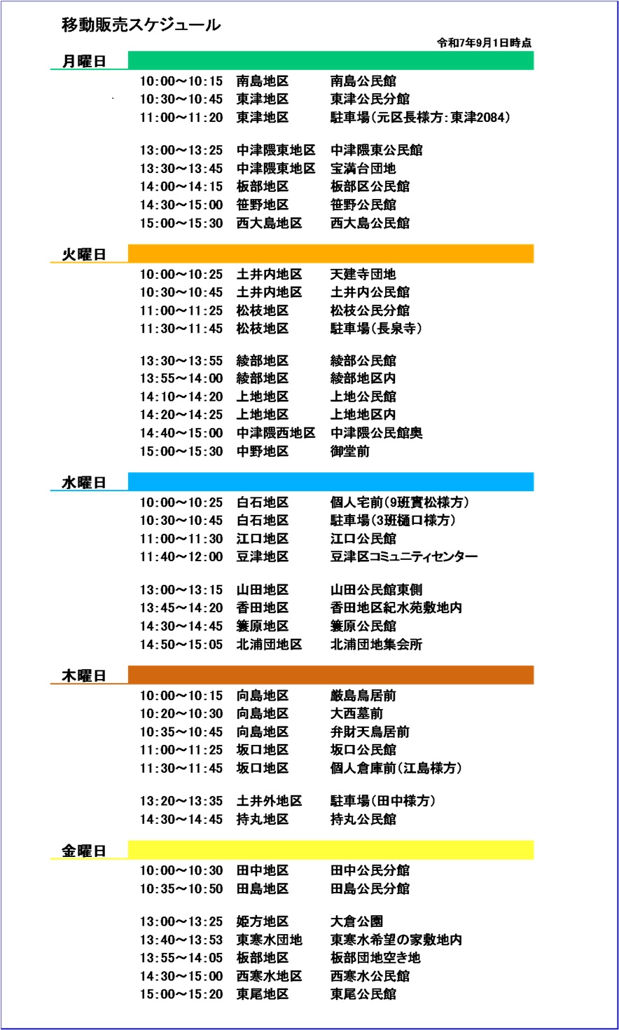 - 移動販売の場所は、曜日と時間帯により異なります。
